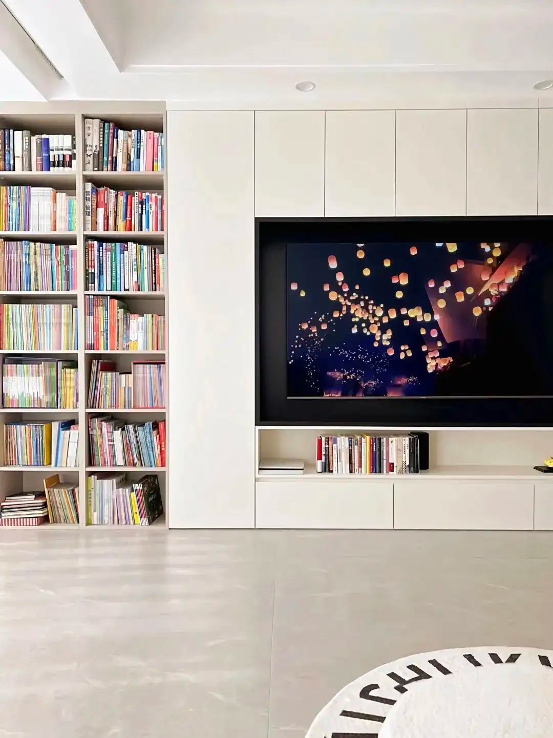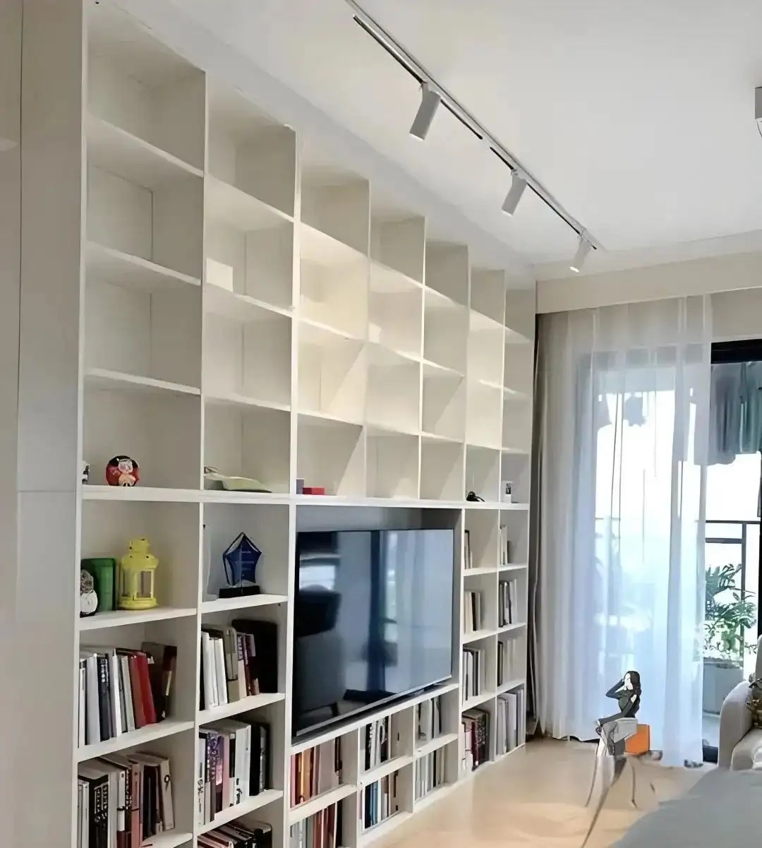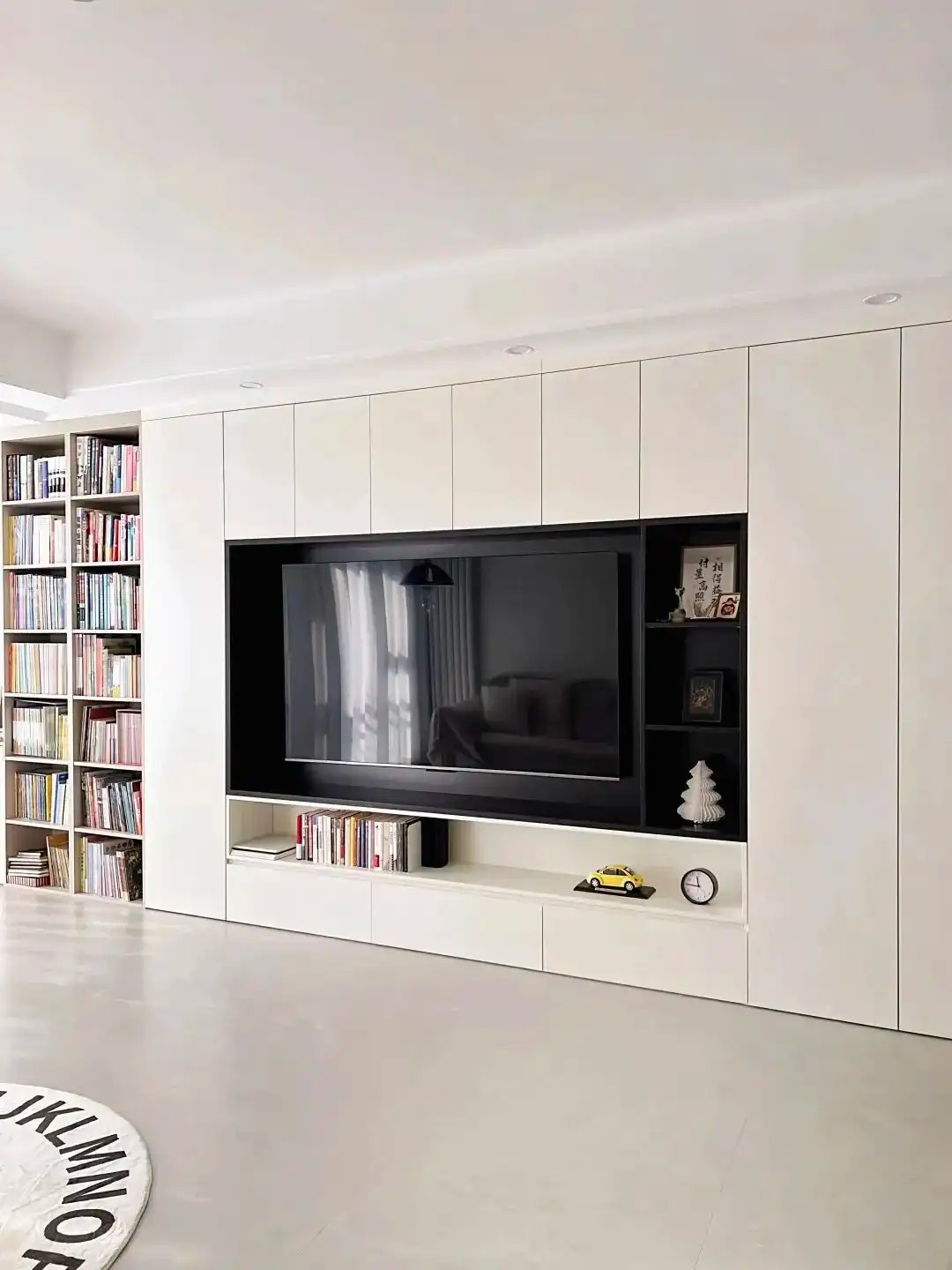 我们可以把电视背景墙弄成“满墙柜”,底部专门设计一些抽拉式格子柜。这样,不管玩具多乱,都能一秒恢复整洁,简直高效到不行!
