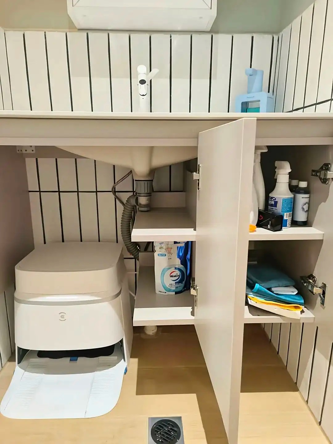 如果我们家里有扫地机器人的话,我们还可以在阳台柜的底部设计一个“无底板”的柜子,让扫地机器人可以“自由进出”。