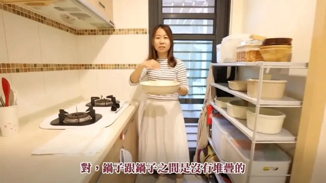 为了减少户型带来的硬伤,JT将烹饪时会用到的所有锅具,都整齐收纳在灶台对面。