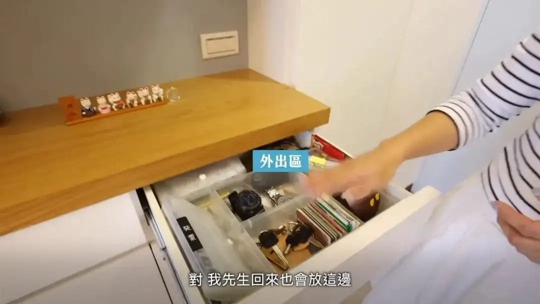 拉开台面下方的抽屉,里面就整整齐齐地收纳着各种车钥匙、购物卡、信用卡等等。