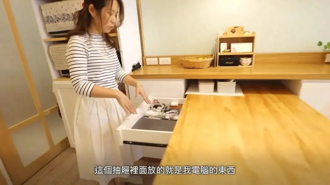 打开抽屉,里面整齐收纳着笔记本电脑,平日JT会在这办公,对于小户型来说,非常实用。