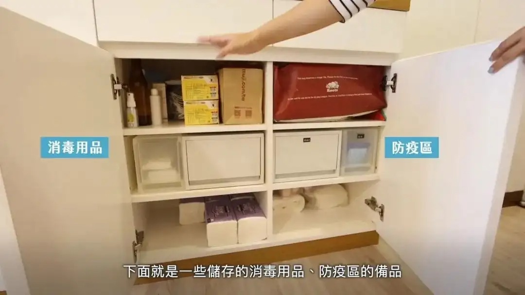 最下方的柜子,则是用来储存防疫、消毒用品的区域, 比如口罩、酒精、卫生纸等等。