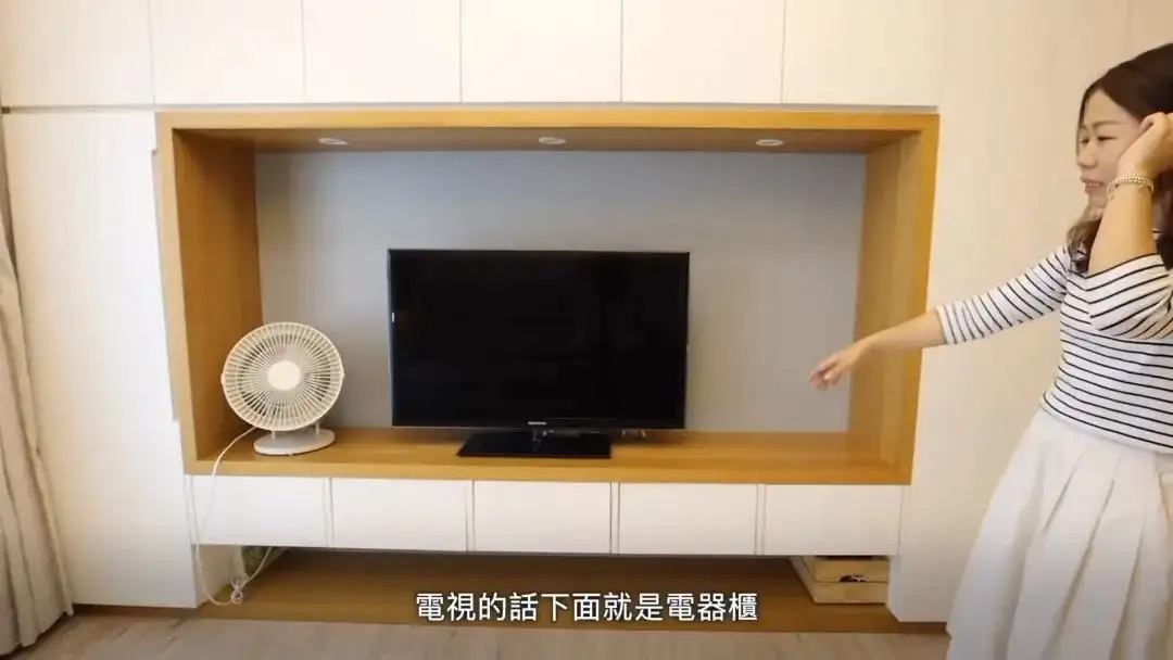 满墙通顶柜中间留空放置电视,四周则继续作为储物空间,进一步增强这个小户型的收纳能力。