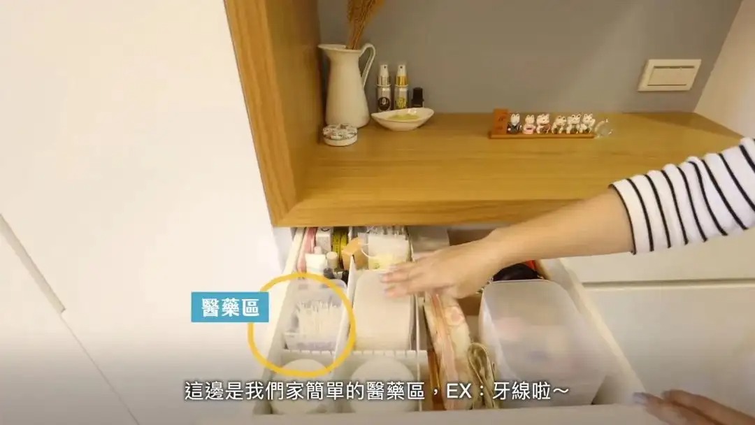 家中常备的各种药物,以及棉签、牙线都整齐地收纳在这里。