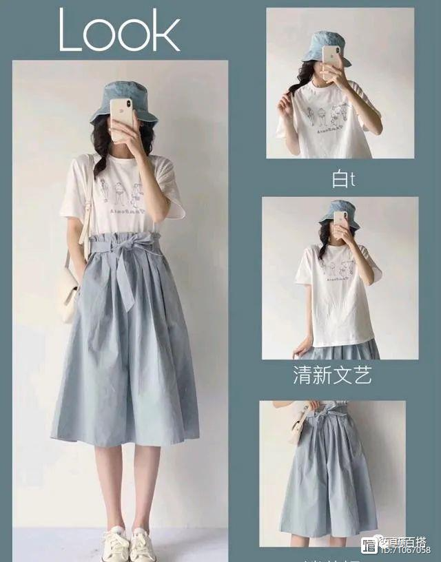就比如这组look,日系小清新风的花苞半身裙,搭配上基础的白T恤,上身就穿出了清甜少女风。搭配的配饰,选择与半身裙风格呼应的日系渔夫帽、小白鞋等单品,轻松变身萌妹纸。