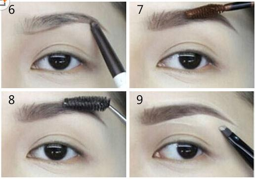 步骤6:用棕色的眉笔画出眉毛的形状,然后进行填充。步骤7:用刷头顺着眉毛的生长方向梳理。步骤8:将眉毛定型,不易脱妆。步骤9:将小号刷子沾高光,在眉尾的位置进行提亮。步骤10:用棕色的眼影在眼窝处进行提亮但是不要超过高光的部分。步骤11:下眼睑的部分不要忽略,描绘出卧蚕。步骤12:用粉色的眼影在白色线条范围内涂抹。步骤13:用粉色的眼影在下眼睑的2/3的部分涂抹。