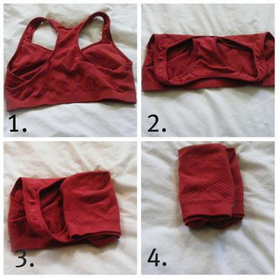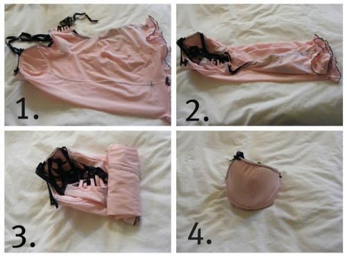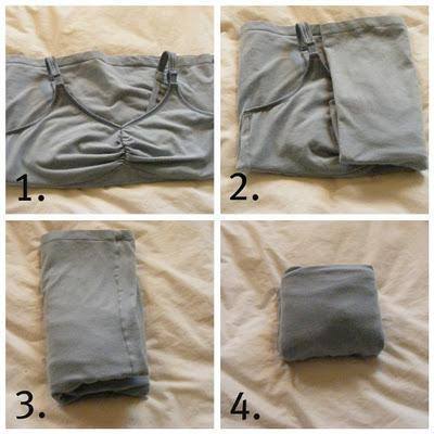 像这种有罩杯的上衣,可以先翻到背面,将宽度对摺、左右罩杯对齐后,在将两侧较宽的部分收进来,将整件衣服摺叠呈长条状,再由下而上卷起,收进罩杯内。