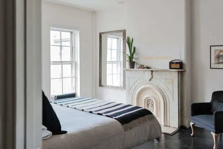 上图的床感觉很宽敞,尽管床占了房间的大部分。这是因为她的床和墙上的艺术品都被安置在房间的下半部分,上半部分几乎是空的。天花板上悬挂的单个灯泡也是为了强调房间的高度。