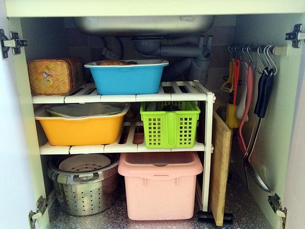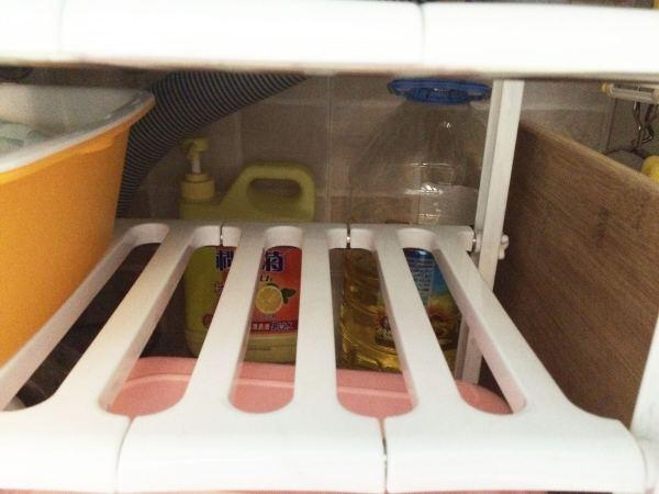 这个质量这还可以,放东西完全没问题,乍眼一看是不是还觉得多整齐?哈哈哈,反正性价比很高就是了。这个架子比橱柜窄,后面还可以放不常用或者备用的东西。