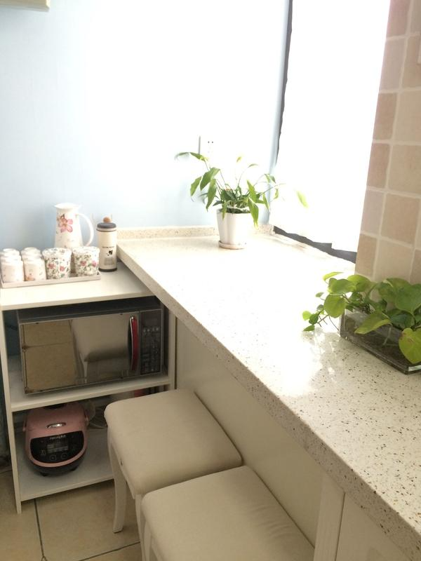 这个竹制置物架是在某宝买的,最下一层放电饭煲,豆浆机,中间放微波炉,上面放水壶,尺寸也是比着位置选的,照片没照全,架子的左边就是天然气管,这个架子刚刚嵌入厨房台面和天然气管中间。妥妥的!现在问题来了,某宝真的能找到尺寸这么合适的各类家具么?当然不能但是一般某宝卖的家具都有好多个尺寸供你选的,你选一个差不多能配合你需要的尺寸,然后让某宝的卖家给你改,比如我这个架子就是改了高度的,把架子最下面一截锯掉,刚刚留成我需要的尺寸就好。如果宽了呢?宽了就剧橫着的置物板呀!现在某宝竞争这么大,一般改尺寸都不会怎么加钱,比商场性价比高多了,商场你改什么都收钱的。