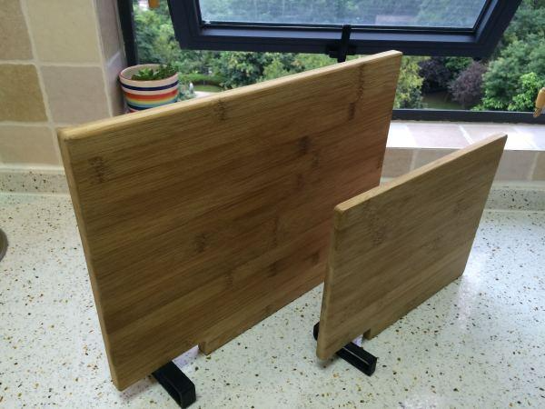 立式菜板下面黑色的支脚可以旋转,切菜的时候保持和菜板成一个平面,用完可以旋转支脚,与菜板成90度,这样可以自然晾干菜板。