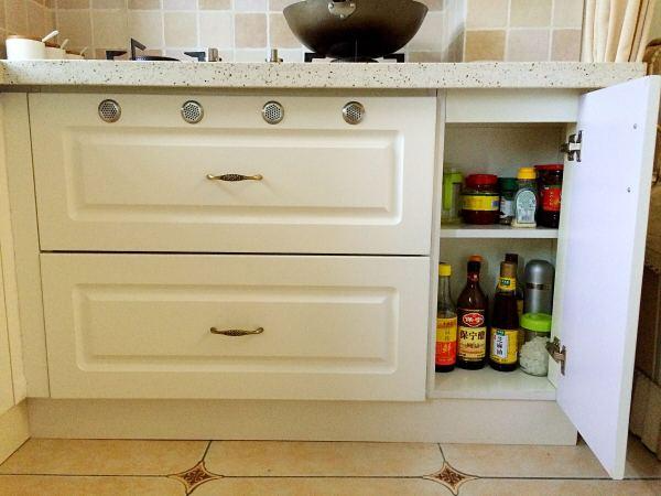 为了保持台面整洁,所有调料都是放柜子里的。而放调料这一小块本来橱柜厂商是没打算做的,估计是觉得后面有柱子,不方正,做起来耗时间,然后就告诉我这一小个柜子做起来也放不了什么东西,让我别做了。……呵呵,这是在给我开玩笑么???我一个穷逼,只能买个单间配套,本来都没地方收纳,你还让我少做柜子?后来在我的一再坚持下还是做了,柜子在右手边,拿来放调料,很顺手!本来橱柜隔板上下是等高的,调料瓶有点放不进去,但是后来我发现橱柜所有的隔板都是可以调节的。我一女汉子,电钻,工具箱一应俱全,调整隔板高度自己动手完全没有问题。最后根据调料瓶的高度调整了一下隔板,所有调料都能放进去了。所以家具尺寸一定要定做,一定要定做,一定要定做。如果自己动手能力差的话,那在设计的时候就要考虑好尺寸,直接让家具厂商做成你需要的尺寸就好了。