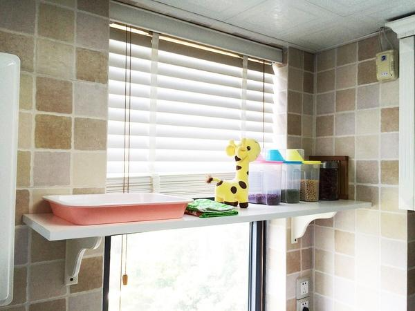 当时做吊柜的时候很想在窗边也做一个的,但是厂家说这样做,后面与墙接触面积太小,固定不稳。但是如果没有吊柜的话收纳又会少很多。后来我就想了个办法就是把窗帘改为百叶窗,然后在墙上加个隔板。这个真是太赞了。非常方便,感觉比吊柜方便多了,伸手就能拿到,隔板比吊柜窄,也不会撞到头。我把滤水盘也放上面了,洗了碗伸手就放上面晾着,非常方便,这样也不会占用台面空间,简直不能再赞了。洗菜盆下面的空间也不能浪费,日本在收纳方面做得非常好,所以他们的置物架也是非常科学的,就是这个架子