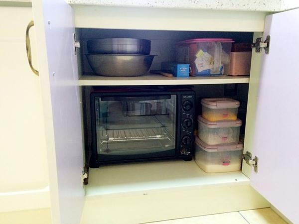 这个是我现在住的单间配套的小厨房,东西一定要少,东西少看起来才整洁。厨房收纳是保持厨房整洁最重要的一个方面,也是一门大学问,我会简单介绍一下收纳技巧。第一:所有家具尺寸要订做,尺寸要订做,尺寸要订做,重要的事情说三遍!这个定做不是说你找人来量个尺寸定制个橱柜就完了,而是你要根据你用的厨房家电规划你橱柜的内部格局,在装修的时候就要预留开关插座等等。我厨房使用频率还是非常高的,偶尔还要烤个蛋糕,烤蛋糕工具非常多,如果不好好规划,厨房会显得杂乱。我的烤箱是放在橱柜里面的,装修的时候就在橱柜里面根据尺寸预留了插座。