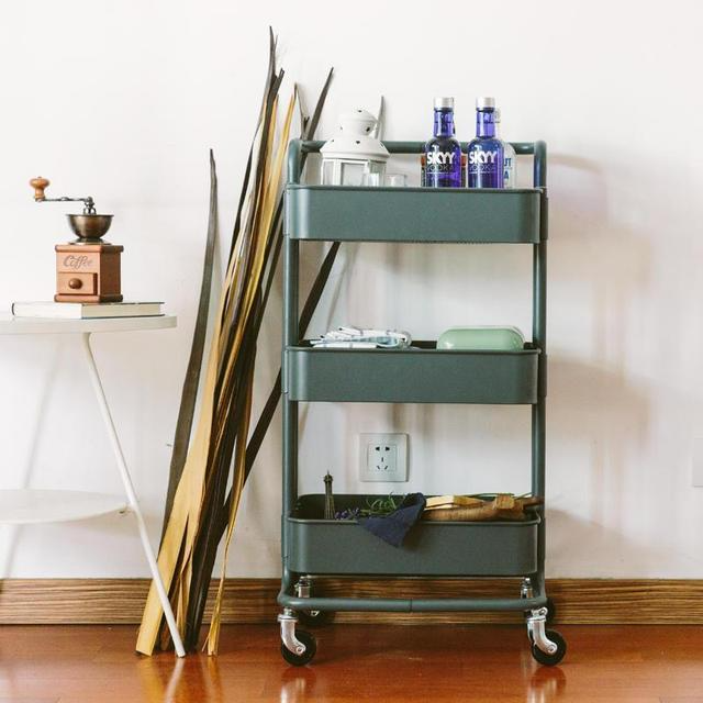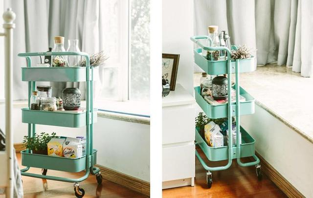 我们来深扒一下这款小推车:每层都有围栏,防止物品跌落,整体采用金属材质,中间层可调节,最大承重可达8公斤,容纳重物也能依旧稳固;360度的万向轮设计,方便挪移,往各个方向推动更省力;简约的设计和别致的造型,也是可以用来摆在客厅的高颜值家具呢。