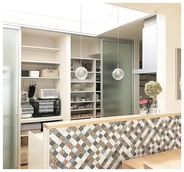 4、厨房收纳是项大工程,不管你会不会收纳,只要认真起来,一样可以把厨房整理得有条有理。根据自己平时使用的喜好,遵循使用拿取方便的原则进行规划。