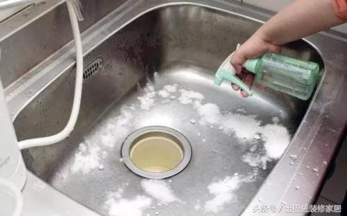 将厨房清洁剂倒在湿抹布上擦洗水池,若滞留的水分产生了矿物质沉积,可使用低浓度醋溶液来清除,再用水完全清洗干净。