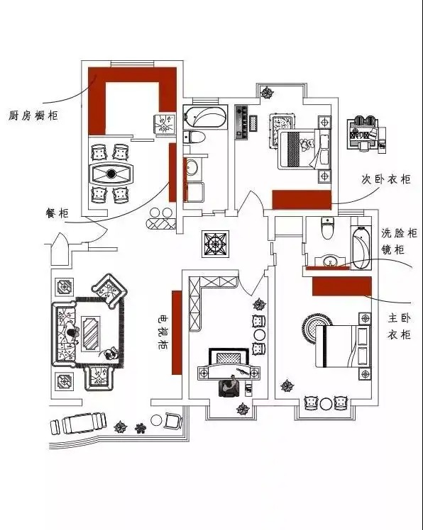 做到各处均布,需要在设计各个空间的时候就将收纳需求考虑在内。例如,选茶几时选择有收纳功能的茶几,在餐桌旁添一个餐边柜,玄关除了鞋柜还要加上挂包和帽子的地方……