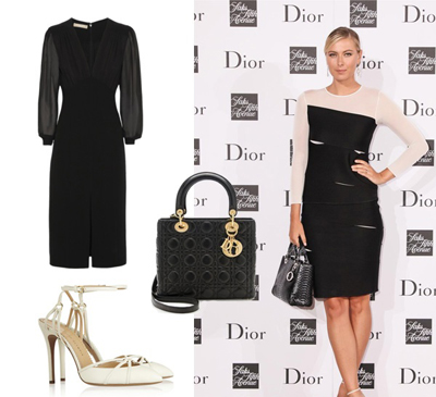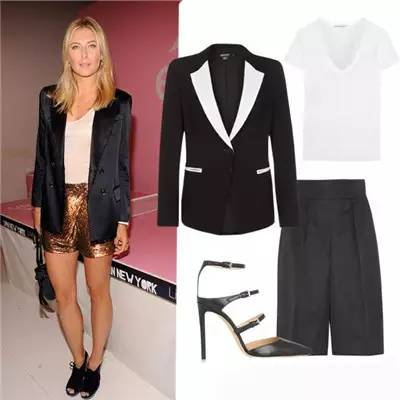 利用材质拼接的时尚单品来雕塑身型。例如莎拉波娃这条黑白相间的连衣裙,肩部采用透明的薄纱面料和长袖设计,巧妙地遮盖了她壮硕的手臂。而拼接的黑色绉纱裙身则起到修饰身体曲线的作用,让整体造型更加高挑纤瘦!