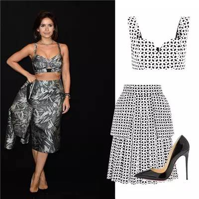 Miroslava Duma利用复古胸式上衣和高腰设计的配套铅笔裙,提升腰线位置,从而拉长全身比例,让自己显得高挑细长。上衣领口正面的下凹设计还巧妙地勾勒出颈下三角区的优美曲线。挑选短款上衣和高腰半身裙进行搭配,定可让你显得分外时髦靓丽!