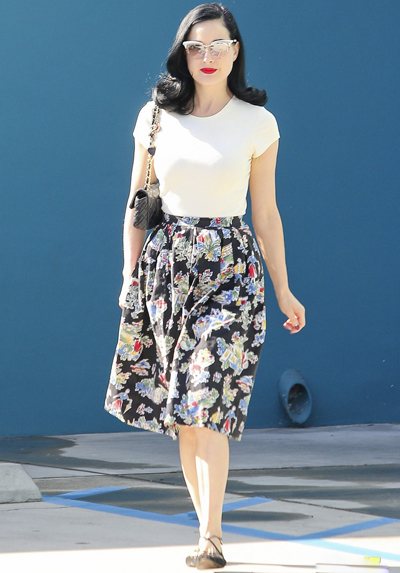 炎炎夏日,怎么能少了印花裙的陪伴。具有A字廓形的印花半身裙和大方简单的白色T恤搭配,完美呈现50年代复古风格。芭蕾舞平底鞋和黑色链条包也给造型增添几分舒适和随意感!