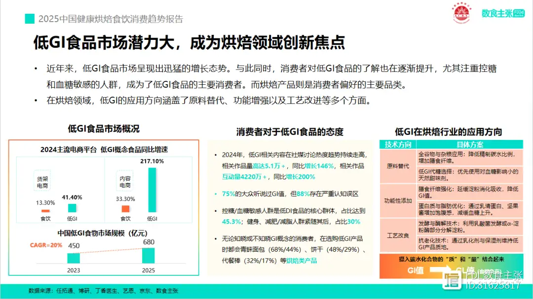 在众多控制血糖的策略中,低GI(血糖生成指数)食品市场正成为烘焙行业的创新焦点。随着消费者健康意识的提升,尤其是那些关注血糖控制和管理的人群,对低GI食品的需求不断攀升,这推动了市场的迅猛发展。仅在2024年,主流电商平台上的低GI概念食品销售额同比显著增长了217.10%(内容电商)和41.40%(货架电商),这一增速远超食品饮料类的整体增长趋势。