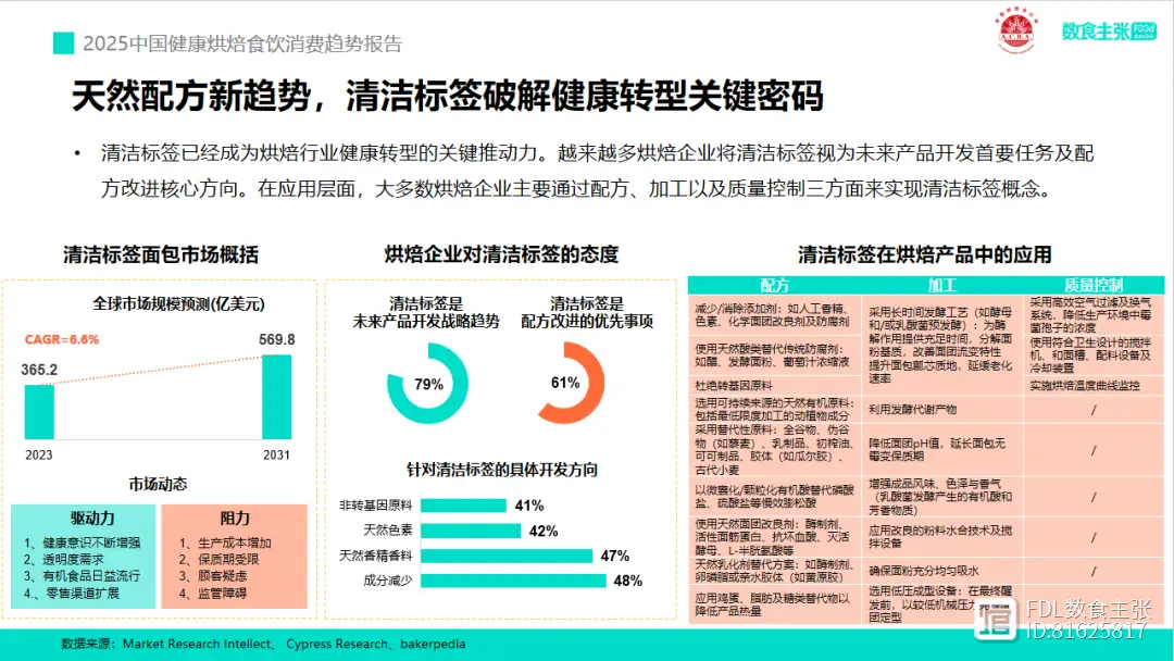 随着清洁标签在食品产业中的迅速崛起,它已经成为引领烘焙行业向健康方向转型的关键动力。据预测,清洁标签面包市场在未来几年将经历显著增长,其市场规模预计将从2023年的365.2亿美元增长至2031年的569.8亿美元,复合年均增长率(CAGR)将达到6.6%。同时,目前有79%的烘焙企业将清洁标签视为未来产品开发的战略重点,而61%的企业将清洁标签作为配方改进的首要任务。