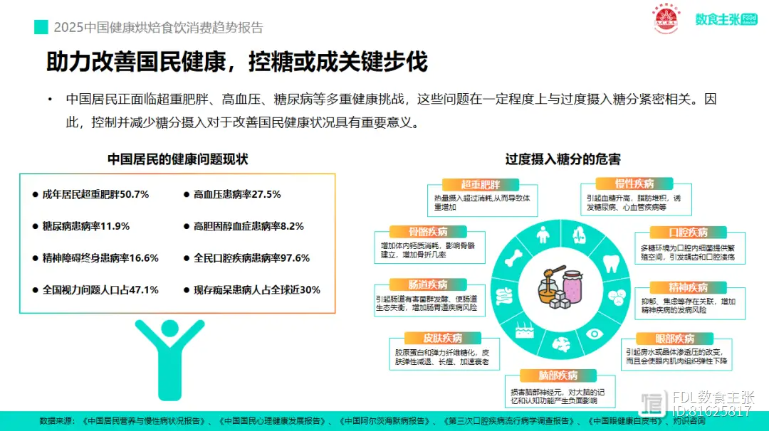当前,中国居民正遭受肥胖、糖尿病、心血管疾病等多种健康问题的困扰。据数据统计,中国成年人中超过一半的人口(50.7%)存在超重或肥胖问题,高血压的发病率达到了27.5%,糖尿病的发病率也高达11.9%,更令人担忧的是,全民口腔疾病的发病率竟然高达97.6%。这些健康问题与过量摄入糖分有着紧密的关联。