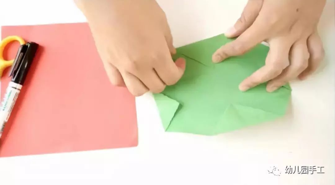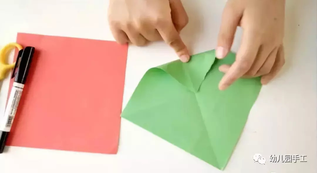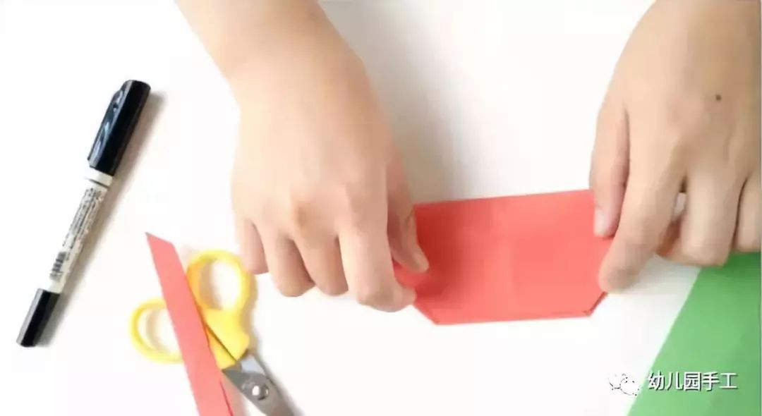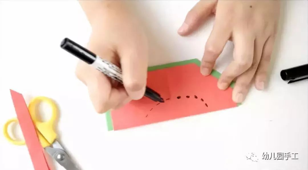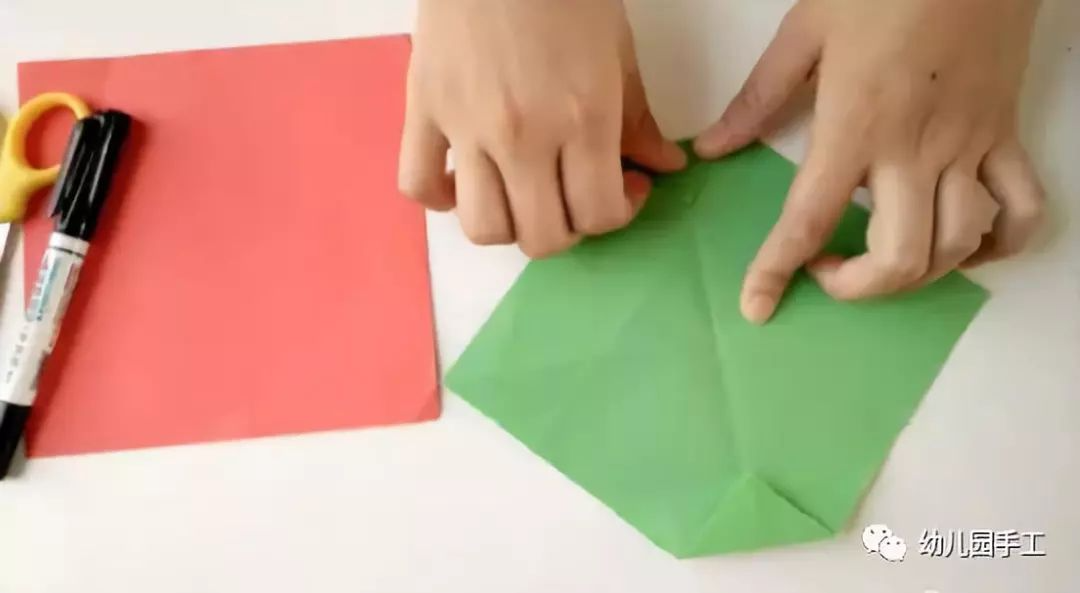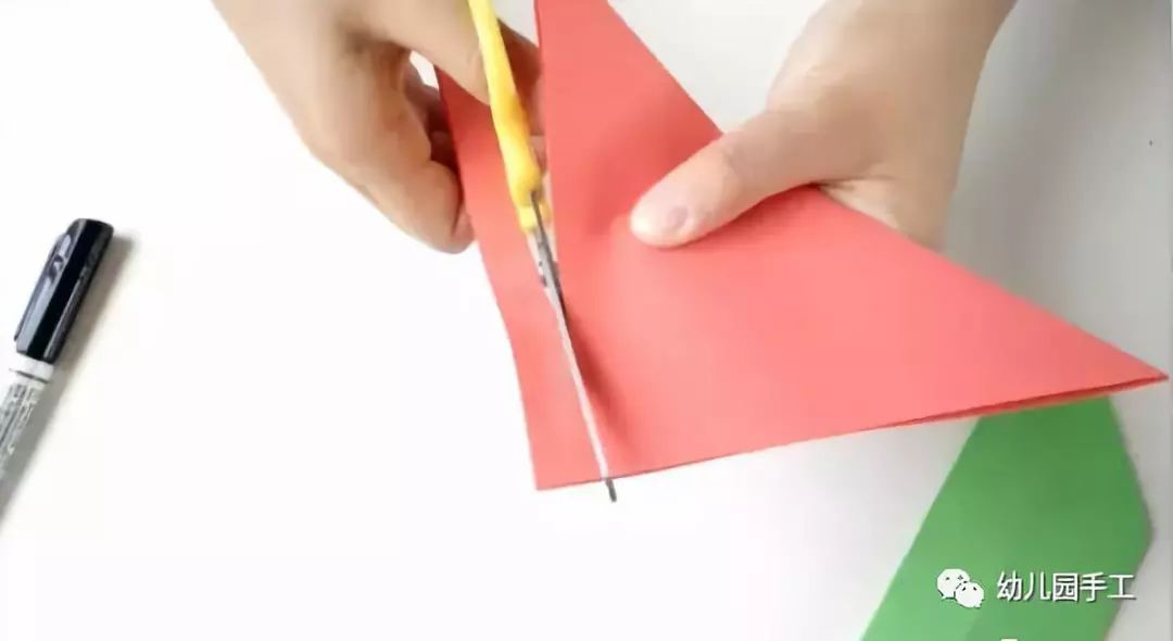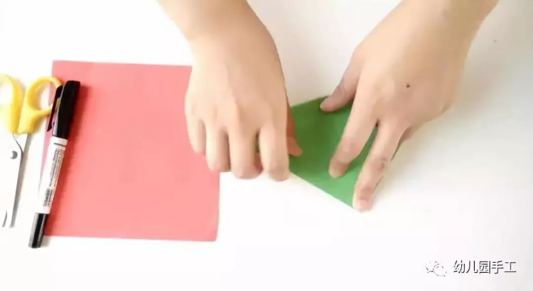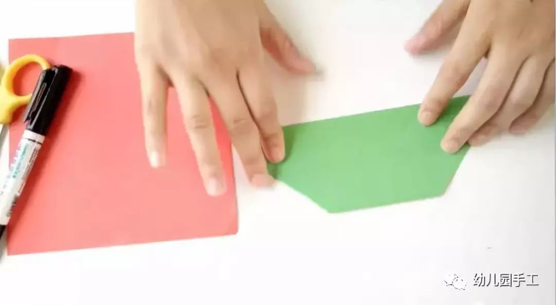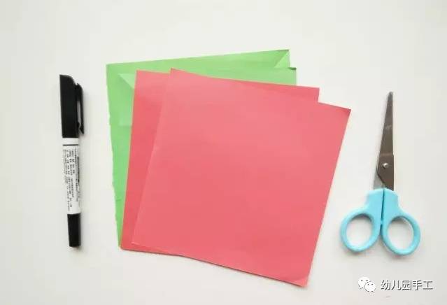准备材料:红色和绿色正方形卡纸、黑色画笔、剪刀
