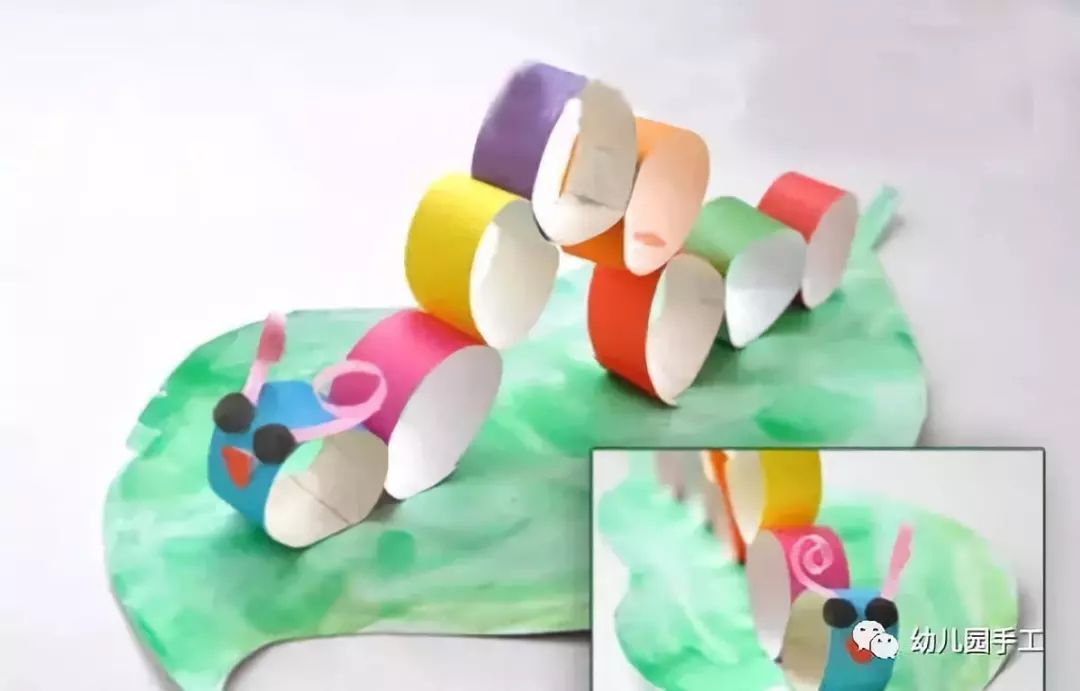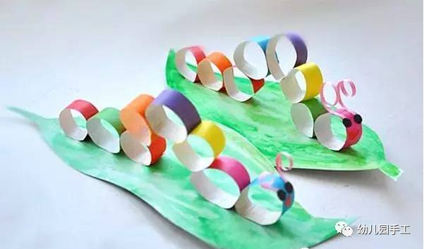 粘贴一起,就是多彩漂亮的毛毛虫了,毛毛虫的动作可自行发挥,可拱起腰,可平爬......再随手涂鸦片树叶,简直更加逼真了呀!