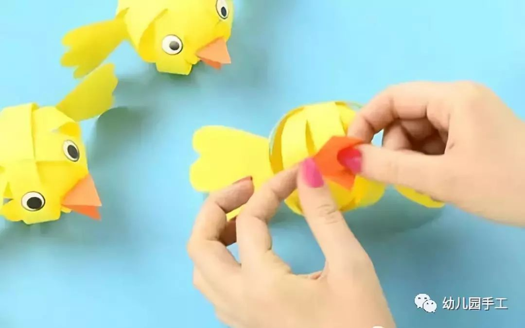 剪出翅膀和小鸡的嘴巴、眼睛,贴在圆球上