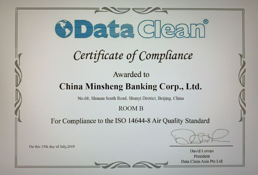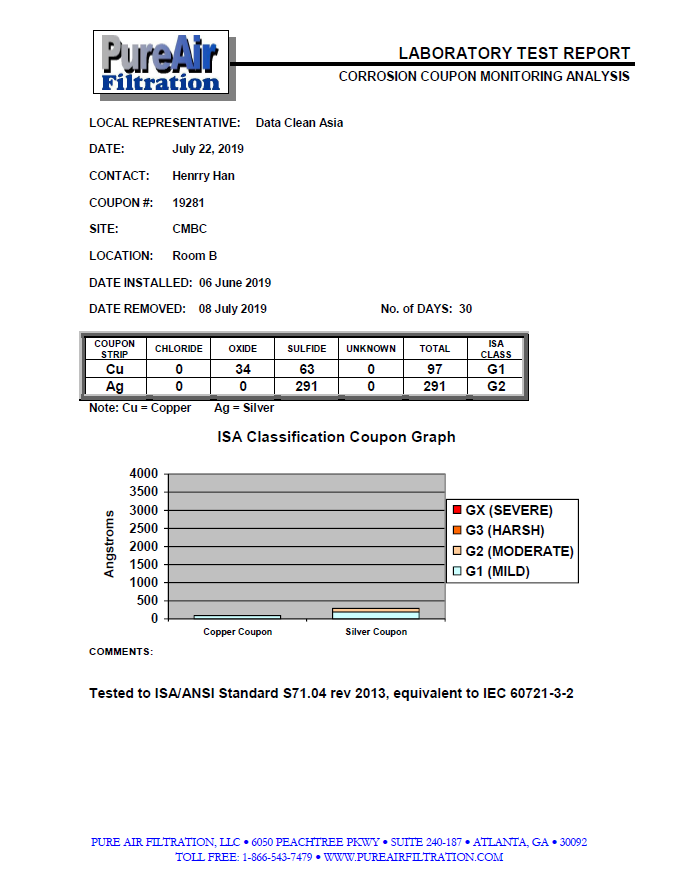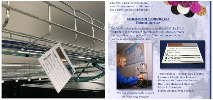 空气检测挂片上装有铜片和银片,在检测位置悬挂30天,之后取下寄到美国的PureAir检测实验室进行腐蚀性检测,得出检测区域空气中污染物的含量,并出具检测报告。报告给出质量评级,可作为检测区域的空气质量依据。马坡数据中心空气质量检测报告结果不但满足国标要求,还达到ISO14644-8 AIR认证标准,因此,我中心也申请并获得了ISO14644-8 AIR认证证书。