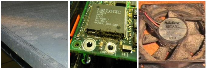 ▲长期运行吸附在设备表面、主板及风扇上的灰尘
