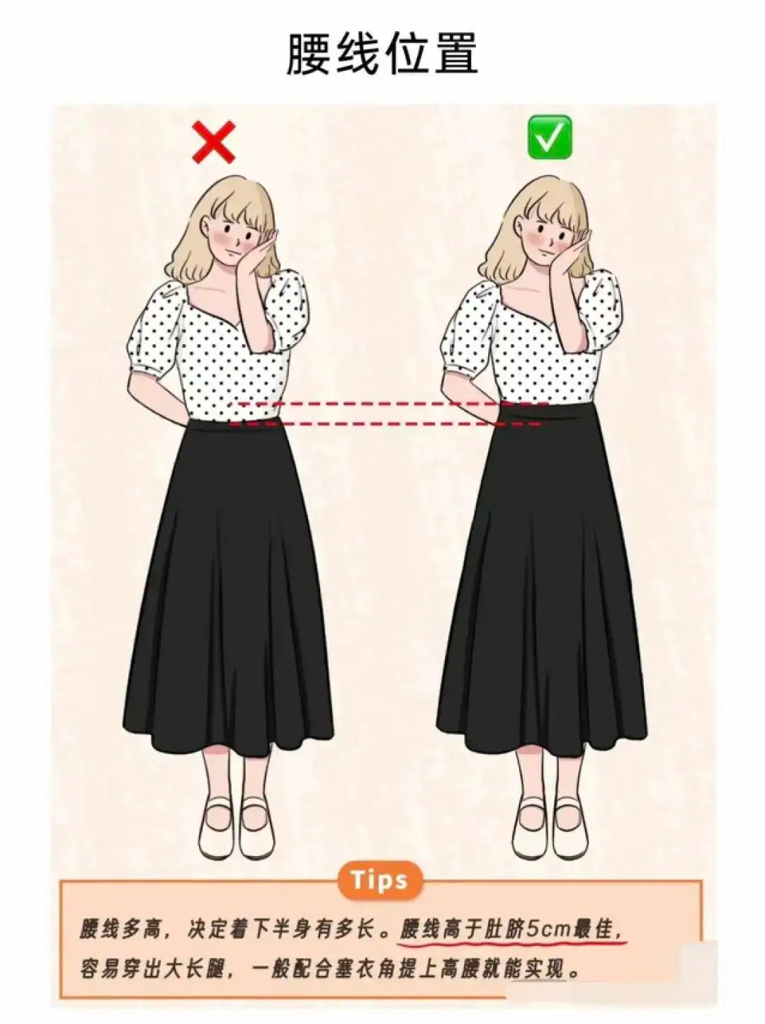 腰线有多高,决定着你下半身看起来有多长。小个子女生必备时尚法则之一就是提高腰线,因此,有腰线且一定是高腰线对于小个子女性来说十分重要!腰线一般位于肚脐上方5cm左右,无论是裤装还是裙装,都容易穿出大长腿的视觉效果。提高腰线,我们常见的有3种方法: