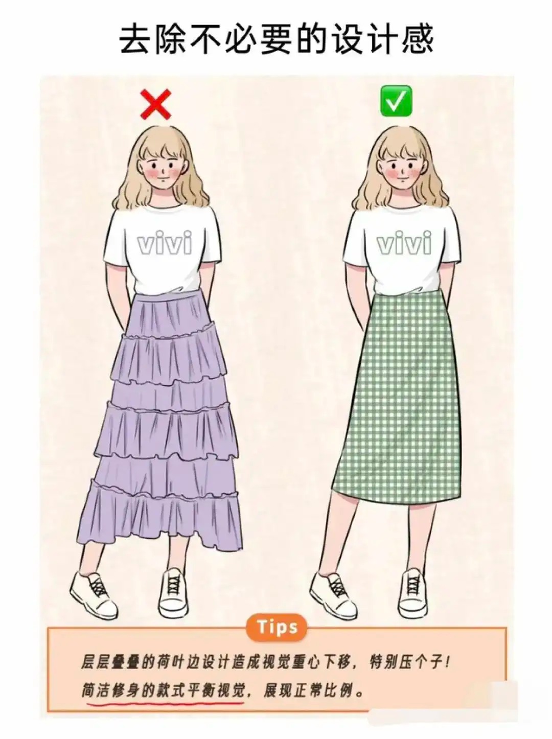 对于小个子女性而言,着装上的“过于装点=累赘复杂”。比如下面这张对比图,左边小人儿简单的白T恤搭配层层叠叠的荷叶边设计半身长裙,上身看起来简洁清爽,但下身复杂冗沉,导致人们的视觉中心下移,特别压个子;