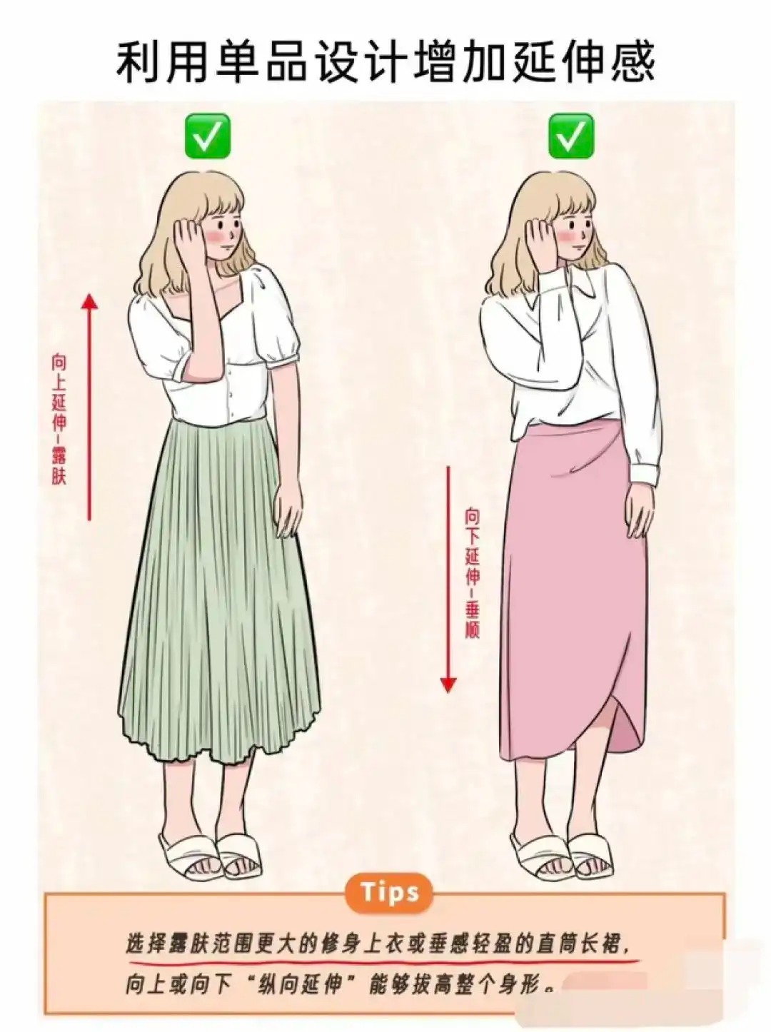 向下延伸(面料的垂顺感):裙子、裤子面料的质感与垂顺度,以及适当加长的长度,视觉延伸下半身。