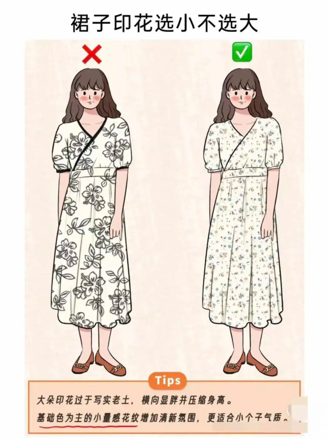 对于我们小个子女性而言,裙子印花选小不选大。衣服上大朵稀疏的印花,过于夸张不说还写实老土、横向延伸显胖还压缩身高,让小个子的存在感更微弱。相反,基础色为主的小量感花纹则更适合娇小可人的小个子,活泼可爱又清新甜美,更符合小个子女生的气质。