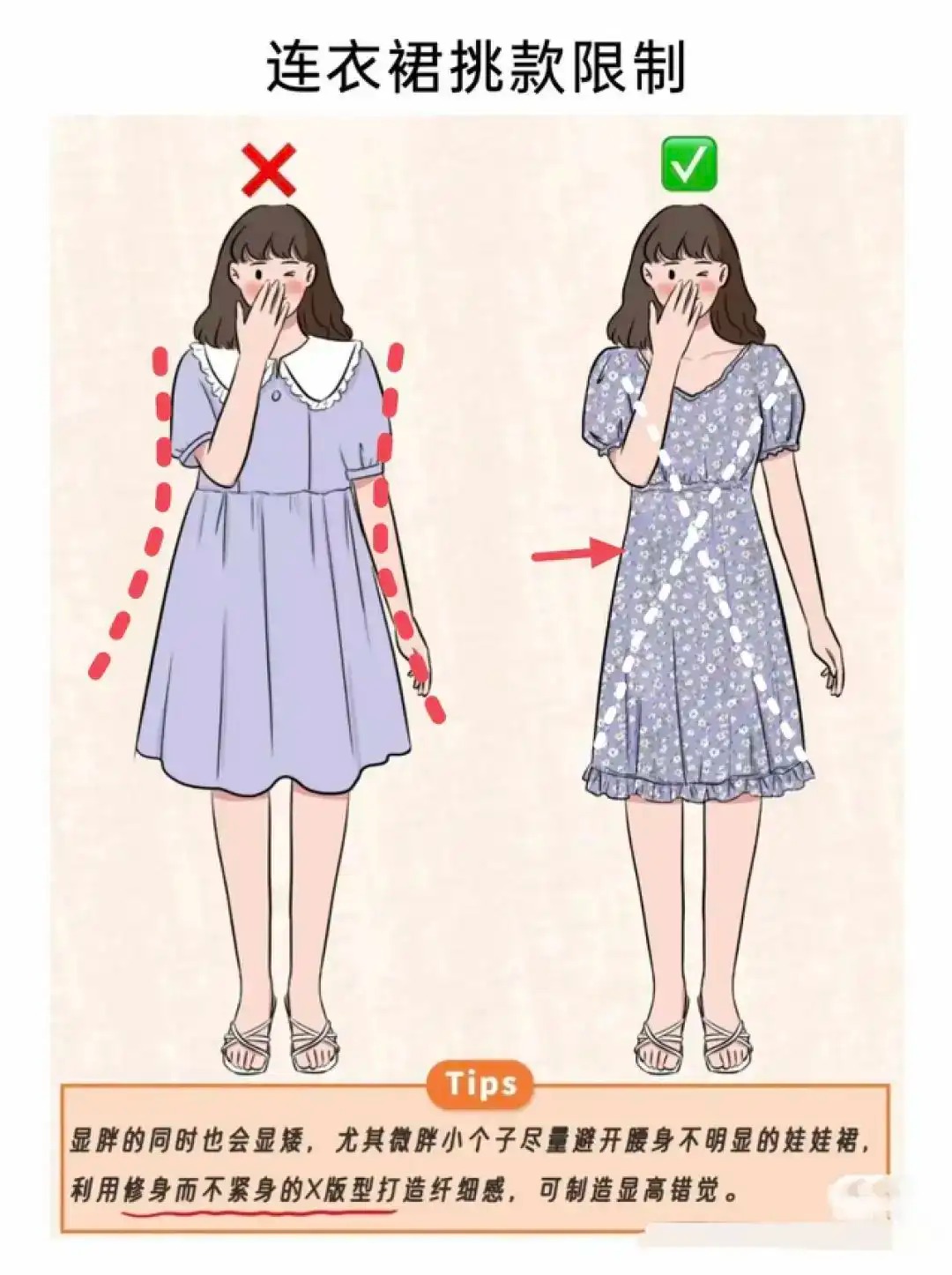 小个子女生穿衣如果想要实现视觉显瘦显高,那么一定不要走可爱风。可爱的娃娃裙,公主裙,蓬蓬裙不仅视觉显胖,还显矮。而有适当修身的X型连衣裙则恰好可以避免视觉过度膨胀的问题。除此之外,腰线明显的X身型,曲线感流露,看起来会更婀娜多姿一点。
