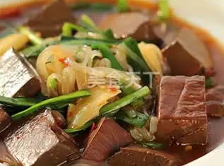 | 食材明细鸭血1盒魔芋粉丝1包韭菜1小把豆瓣酱1大勺葱姜蒜适量淀粉1小勺胡椒粉1小勺油盐适量微辣口味煮工艺1 准备好原材料;2 . 烧锅开水, 放少许盐,将鸭血块放入里面焯一下;3 烧热锅, 放适量的油, 下入葱姜蒜煸炒一下;4 煸炒出香味后放入豆瓣... |