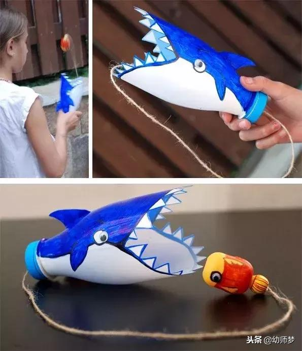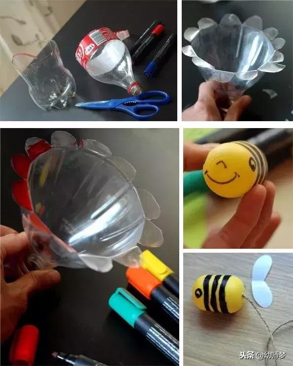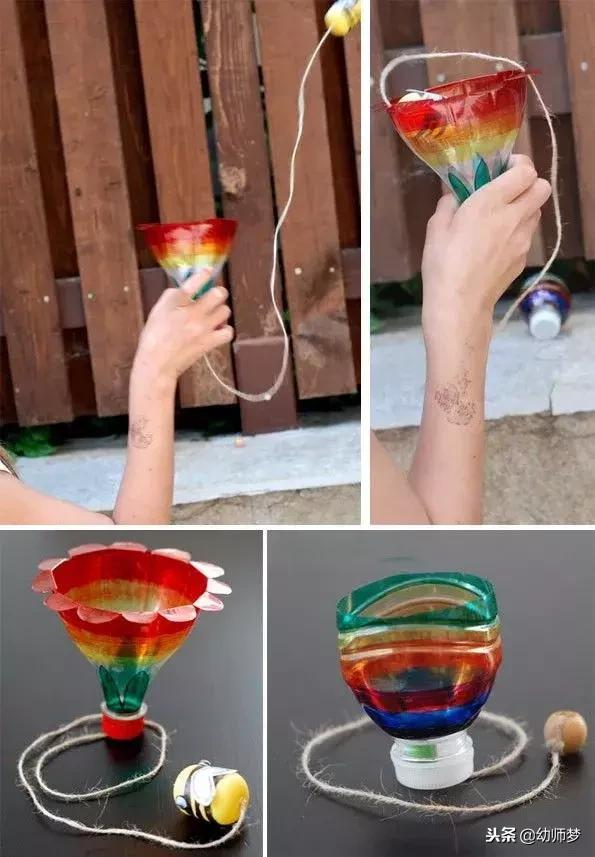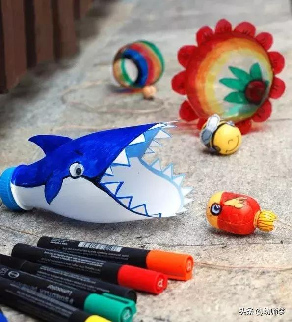 塑料瓶裁剪对于孩子来说有一定的难度,家长或老师要留意剪刀使用安全,瓶盖钻孔也是如此;马克笔作画时可以发挥孩子的想象力,不一定要完全与教程相同;“小鱼”及“蜜蜂”,如果没有材料,可以用珠子或者瓶盖代替,要选择有点重量的,否则很难抛出去。