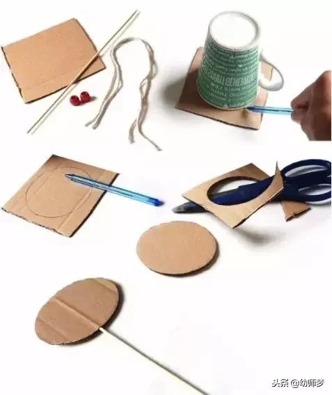 制作步骤:我们可以利用圆形杯口,剪一个圆形卡片,在圆卡片上戳两个小孔~一会将麻绳穿过去哦~