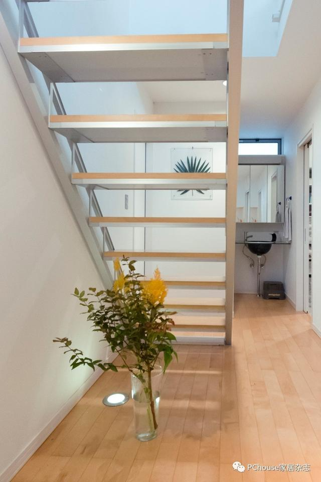 非常窄小的玄关一进门就看到楼梯,为了避免这样的视觉尴尬,伊藤经常在楼梯下面摆上鲜花。