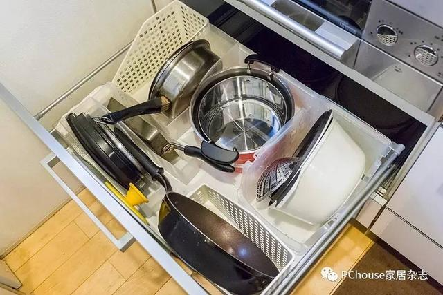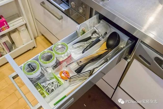 灶台下的空间一样不能忽略。伊藤认为,抽屉的收纳实用性远远大于柜子。但是抽屉的收纳分区一样重要。