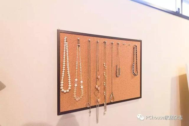 首饰的收纳最简单,将软木板直接挂在墙上,将项链逐条挂在大头针支架上。