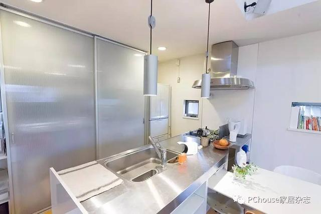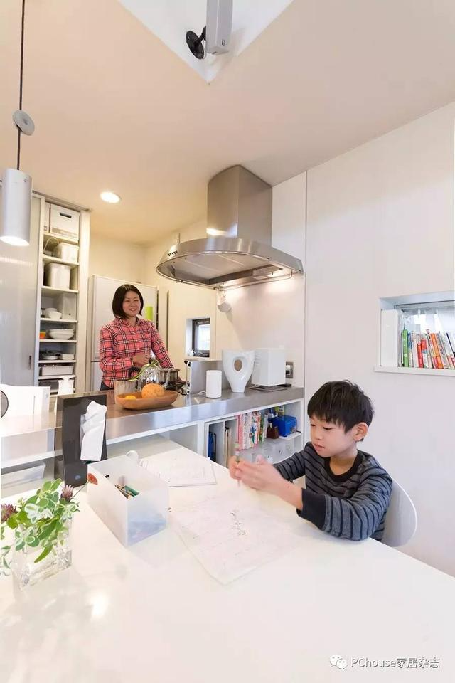 对于一个面积不太大的家来说,分区其实是非常重要的。由于户型的局限,伊藤家的厨房并没有选择橱柜,中岛式的操作台和餐桌T型分布。