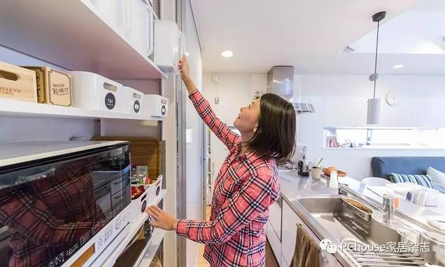 其实伊藤选择在厨房的一面放置了一个超大的储物柜,这个柜子 冰箱占据了一整面墙的面积。