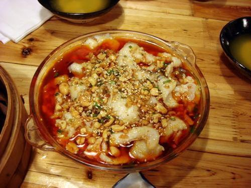 4、将很多(大量)油烧热后加干红辣椒和花椒若干(视个人口味来订),待油锅中辣椒颜色略微变黑的时候,将油浇在鱼片上面。