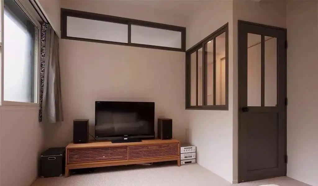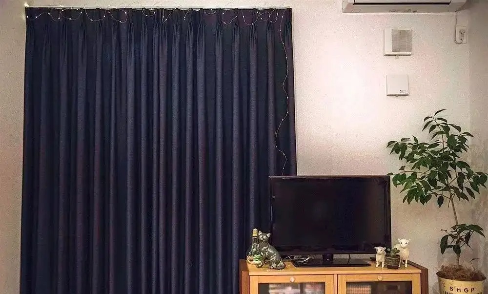 如果窗帘越长,颜色越深,看起来就越重,比对旁边小小的电视和家具,就显得喧宾夺主了。