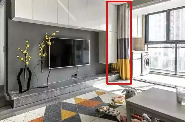 顶天立地的窗帘,气派!可窗帘完全被柜子挡住,不挪柜子怕是摘不下窗帘了,挂上去了就没想摘下来了吧。