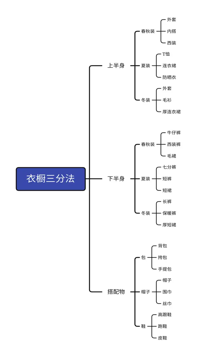 使用“三分法”归类是指把自己想分类的物品按照“大中小”三类来划分,然后重复三遍,再重复三遍,一直重复到小分类部分完成才可正式进入收纳阶段。举个例子,我们首先把衣橱里的物品分为三个大类“上半身”“下半身”和“搭配物”,如果再把“搭配物”进行三个中分类则可以是“包”“帽子”和“鞋”,继续把“包”进行三个小分类可以是“背包”“挎包”和“手提包”,其他品项以此类推,我做了个思维导图供大家参考: